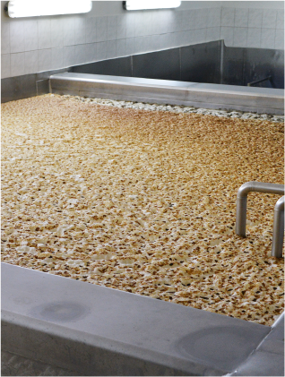 First, the brewers mix the milled grains them with warm water in a vessel called a mash tun to form a porridge-like mixture called mash. The temperature of the water is carefully controlled to activate enzymes that break down the malt’s natural enzymes into simpler sugars. At this point, some brewmasters will add corn or rice to make the beer lighter in body and flavour. This process creates a sweet liquid called wort.